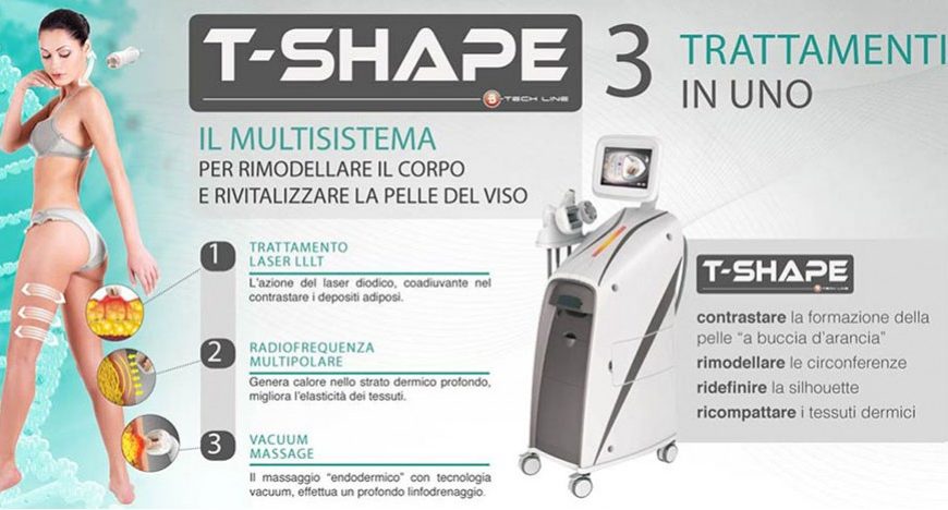 T-Shape combina 3 potenti tecnologie che agiscono contemporaneamente favorendo la produzione di collagene e determinando una considerevole riduzione localizzata dei volumi adiposi e delle lassità cutanee per un immediato incremento della circolazione sanguigna e del drenaggio linfatico che migliora la forma fisica.